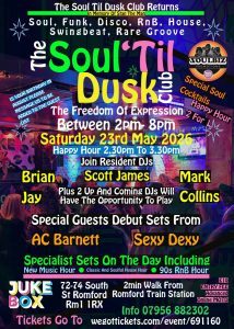Soul Till’ Dusk is about “the freedom of expression” we are giving the opportunity to new DJs to play there chosen sets for the first time. We will also be having a Genres hour as well featuring, 90s RnB and Classic and Soulful house hours, plus new music hour as well. It’s all happening all crammed into the afternoon, for your musical pleasure, as we roll into the evening with all your party favourites.