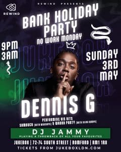 REWIND is BACK 🔥 We’re bringing the energy this Bank Holiday with a HUGE live performance from Dennis G performing his anthems “SAMBUCA” & “WANNA PARTY” 🎤💥 Plus DJ Jammy on the decks spinning all your favourite throwback bangers all night long 🔊🔥 ⸻ 💥 BANK HOLIDAY = NO WORK MONDAY 💥